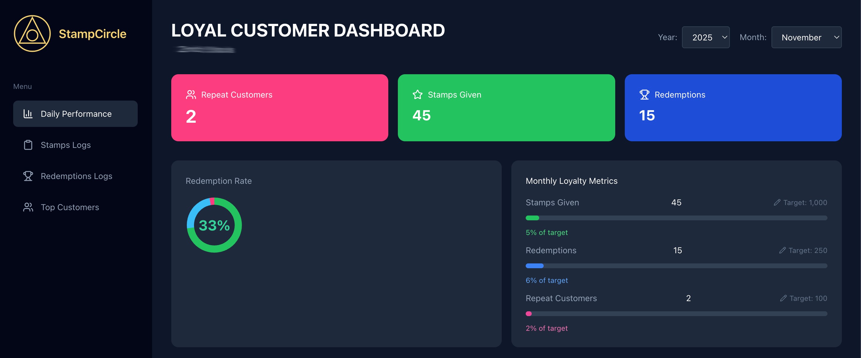 * A repeat customer is counted when they earn at least 1 stamp or redeem any reward in a month. Only 1 count per customer per month, regardless of activity volume.