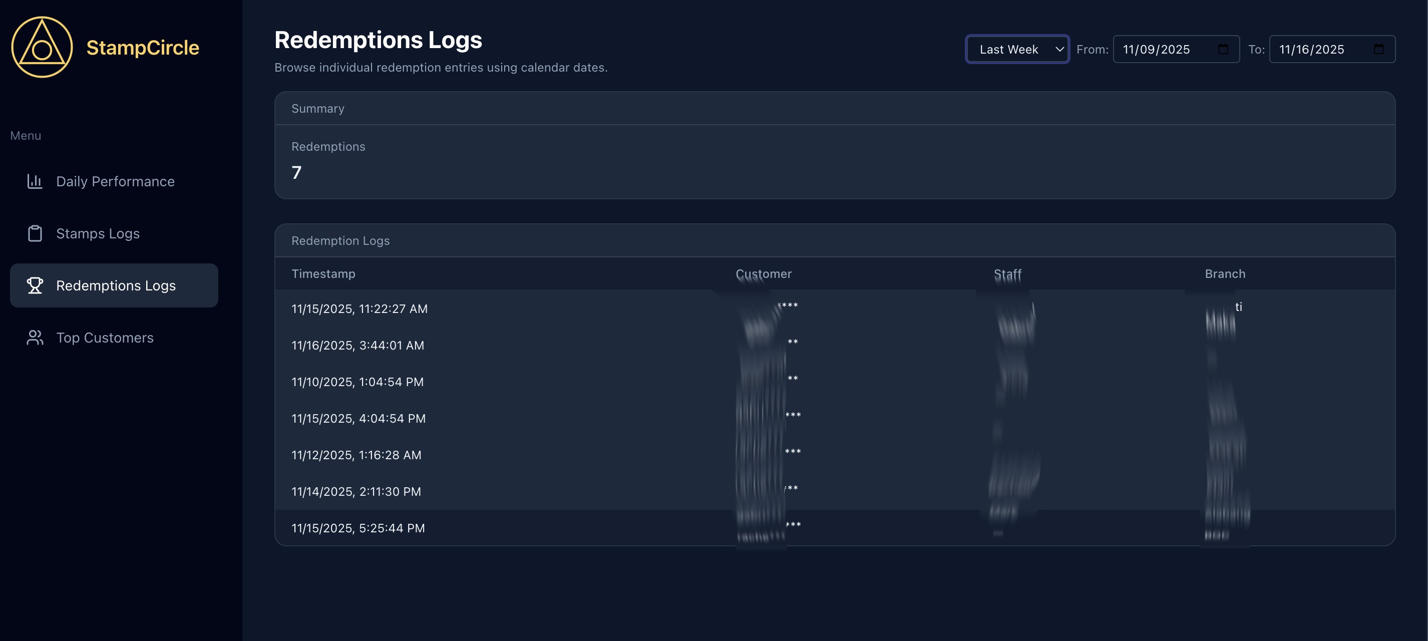 See every stamp given and reward redeemed as it happens so you can monitor peak hours, track campaign performance, and quickly spot changes in customer activity.